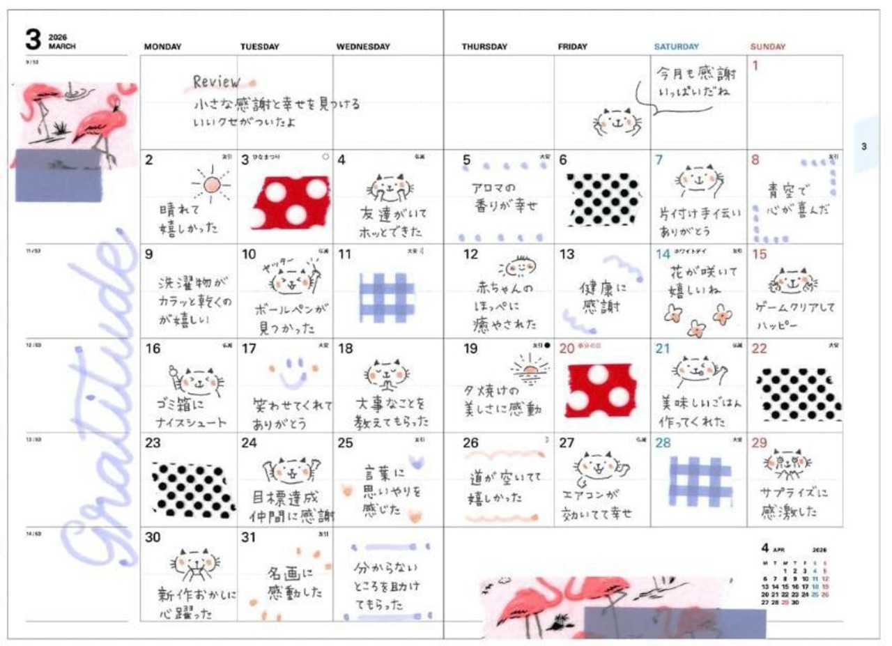 カバーの表側にもプリントがされているので、ペンや付せんなどの小物をいれると柄との重なりも楽しむことができます。