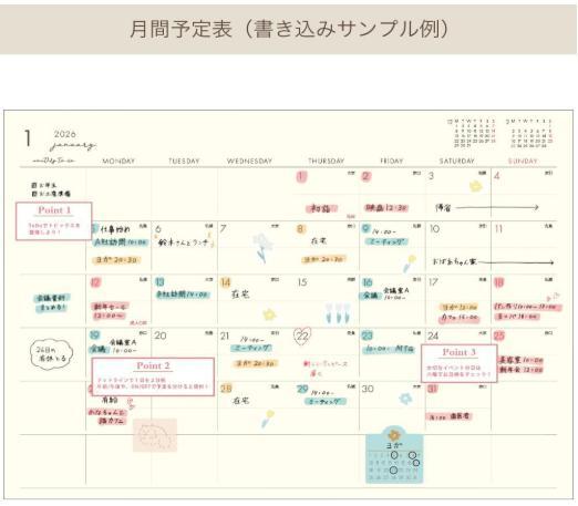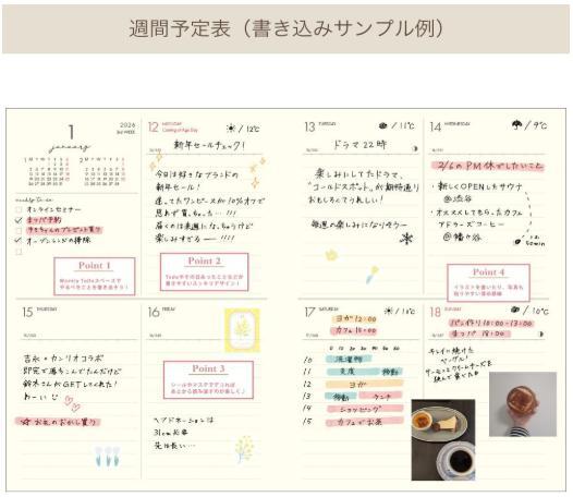 *見開き1 週間のブロックタイプ。スケジュールはもちろん、ライフログをつけたり、写真を貼ったり、ステッカーやマステでデコったり…ライフスタイルに合わせて使える自由度の高いフォーマットです。まんまるのシマエナガが仲良くおしゃべり。