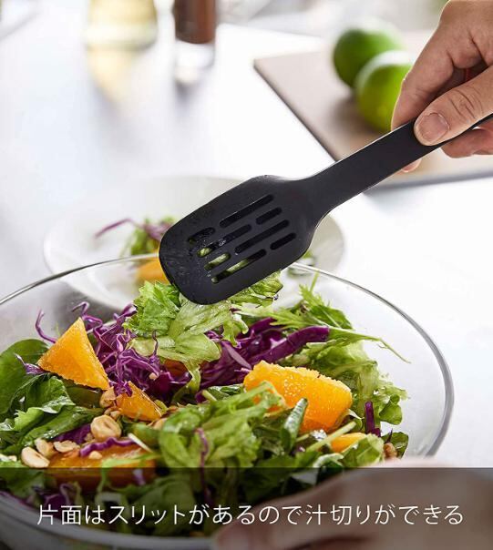 片面はスリットがあるので汁切りができます。 スプーン形状で盛りつけた後にソースをかけれます。 シリコーンコーティングのキッチンツールシリーズ。 シリコーン製で滑りにくく、熱に強く、弾力性に優れ、 ボウル・ナベ・フライパンなどを傷つけません。 また、先端が浮くので直置きにならず清潔。